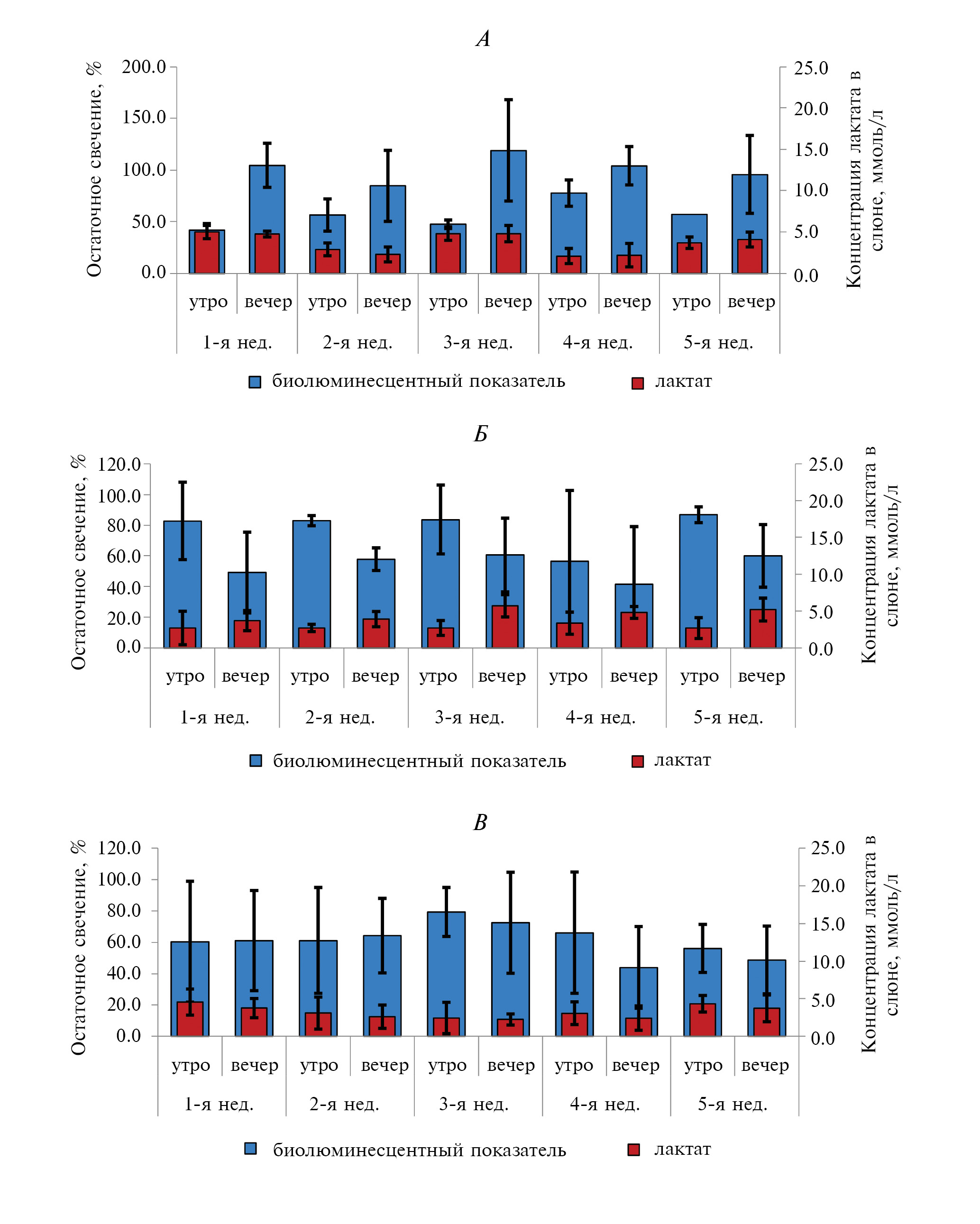 Изначально были выбраны 2 группы участников, слюна которых изучалась всеми вышеперечисленными методами. По результатам биолюминесцентного тестирования участники, входящие в первую группу относительно здоровых сотрудников, отличались устойчивой реакцией на нагрузку. Это выражалось в том, что величина остаточного свечения для каждого испытуемого либо всегда увеличивалась после рабочей смены, либо всегда уменьшалась. Поэтому участники первой группы разделились на 2 подгруппы. Для обследуемых первой подгруппы характерно устойчивое повышение уровня остаточного свечения после рабочего дня (рис. 1, А). Для обследуемых второй подгруппы относительно здоровых сотрудников характерно устойчивое понижение величины остаточного свечения после рабочего дня (рис. 1, Б). Измерение концентрации лактата в слюне участников первой группы показало отсутствие физических перегрузок или усталости (рис. 1, А и Б). Такие результаты хорошо согласуются с результатами анкетирования данных работников, где они утверждают, что не испытывают перегрузок на рабочем месте.