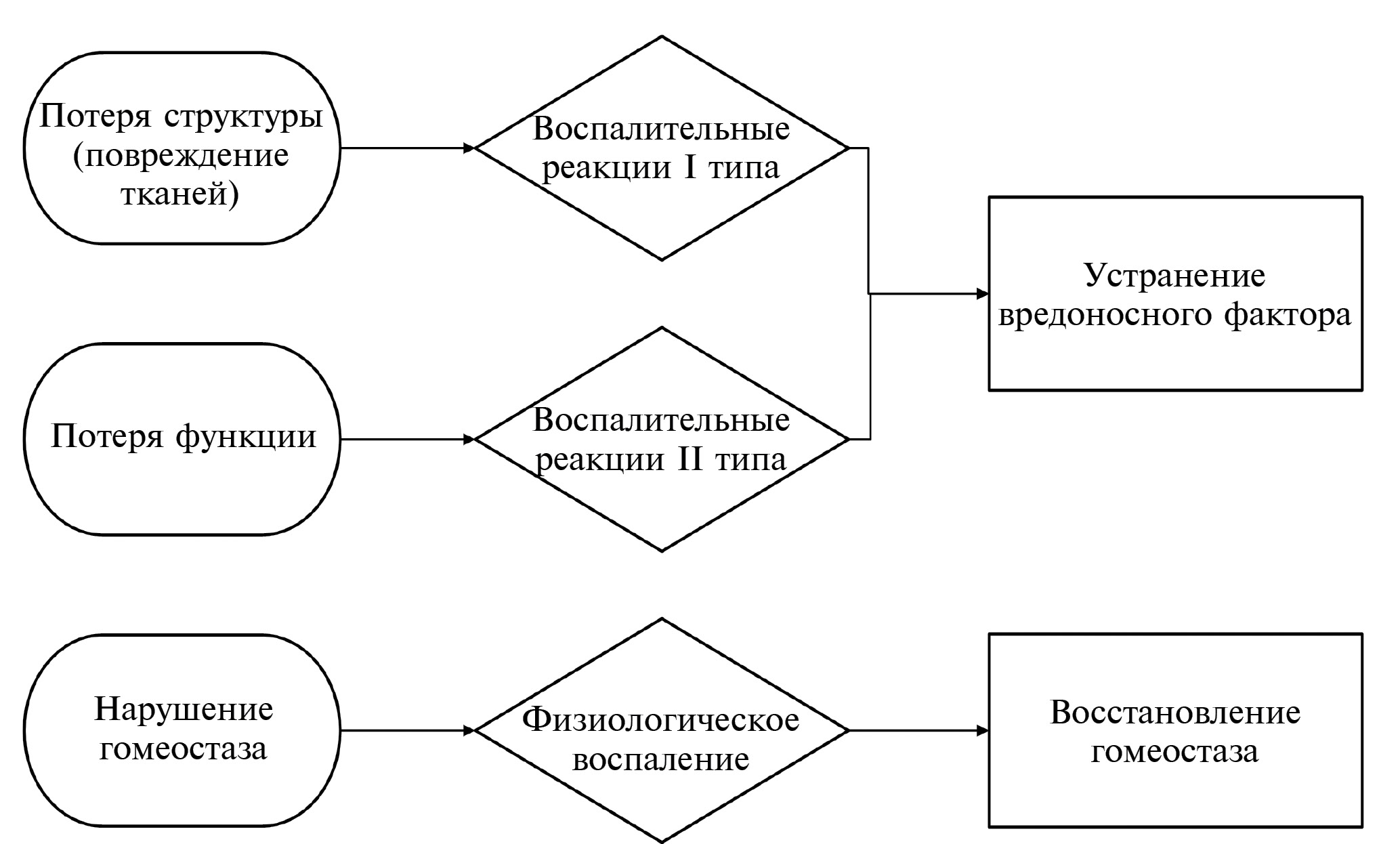Все три типа системных нарушений – потеря структуры, потеря функции и потеря регуляции – могут вызывать воспалительные реакции. Эти ответы имеют разные модальности, характеризующиеся участием разных клеточных и молекулярных компонентов и разной степенью интенсивности ответов. Все три типа воспалительных реакций преследуют две цели: 1) устранение того, что вызвало нарушение; 2) адаптация к структурным, функциональным или регуляторным изменениям [2].