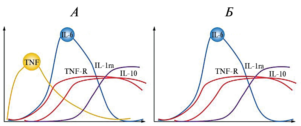 Рис. 2. Сравнение увеличения циркулирующих цитокинов, вызванного сепсисом и физической нагрузкой. А – сепсис; Б – физическая нагрузка (адаптировано по [17])