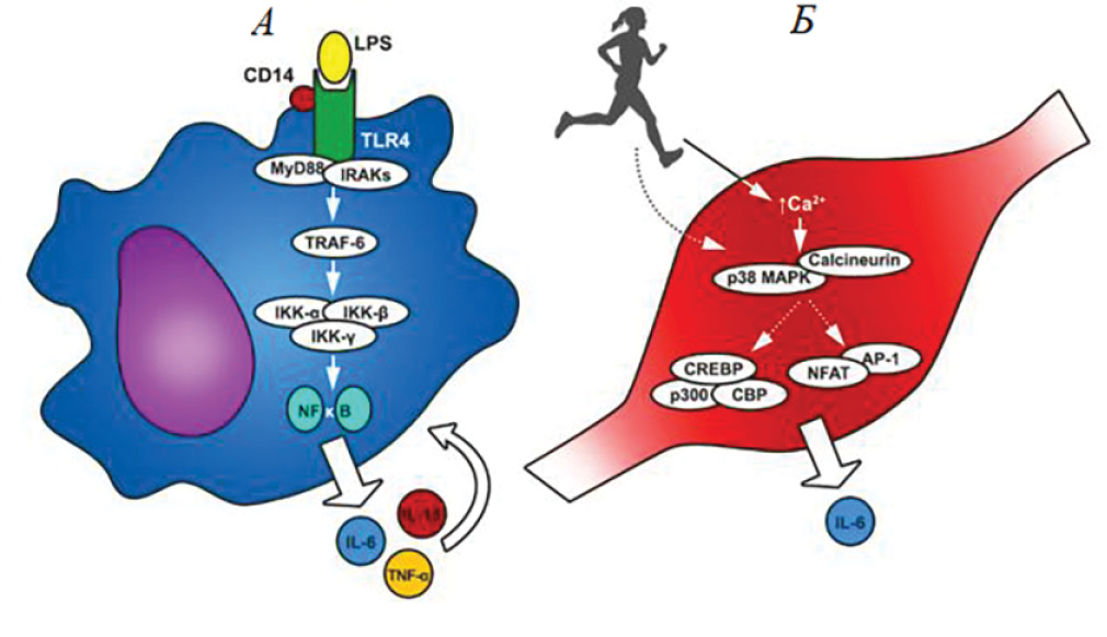 Рис. 3. Предполагаемые цитокиновые сигнальные пути для макрофагов и мышечных клеток. А – макрофаг; Б – скелетная мышца (адаптировано по [17])