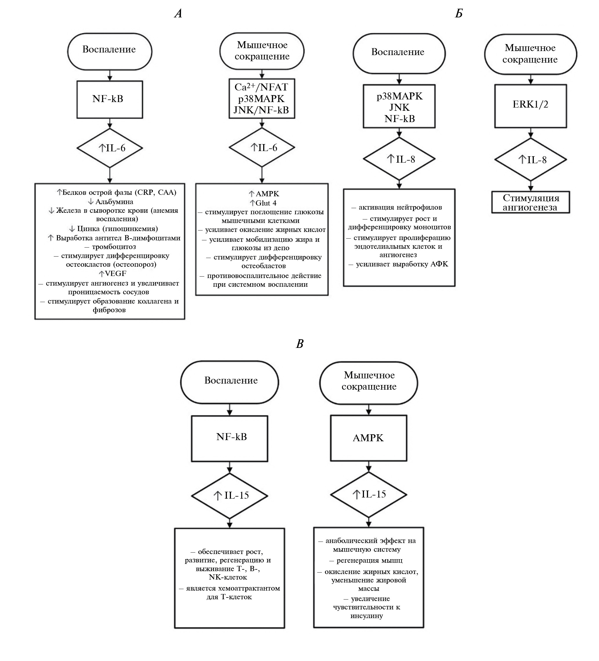 Рис. 5. Сигнальные пути экспрессии миокинов и их биологическая роль при воспалении и сокращении скелетных мышц. А – IL-6; Б – IL-8; В – IL-15
