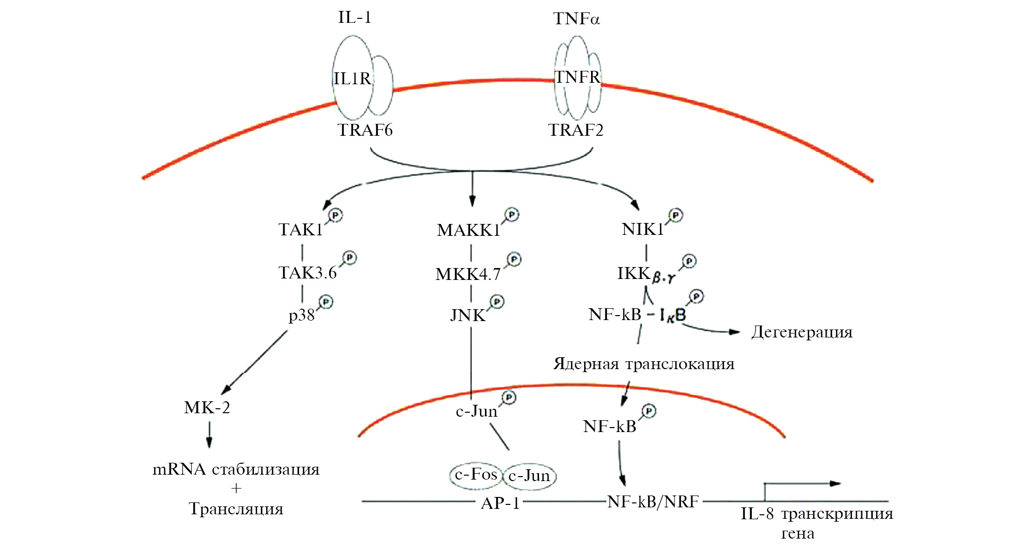 При воспалительных реакциях экспрессия гена IL8 регулируется через сигнальные пути IL-1R и TNFR. Сигналы, опосредованные путями IL-1-IL-1R162 TRAF6 и TNFα-TNFR-TRAF2, активируют три общих пути MAP-киназы. Активация NIK1-IKKβ приводит к фосфорилированию и деградации IκB, обеспечивая транслокацию NF-κB в ядро. Активированный JNK фосфорилирует c-Jun с образованием активного комплекса AP-1 [61].