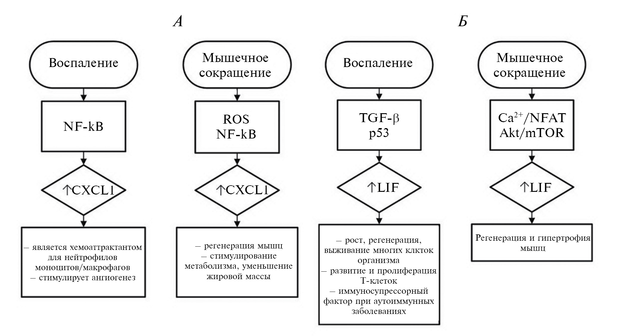 Рис. 7. Сигнальные пути экспрессии миокинов и их биологическая роль при воспалении и сокращении скелетных мышц. А – CXCL1; Б – LIF