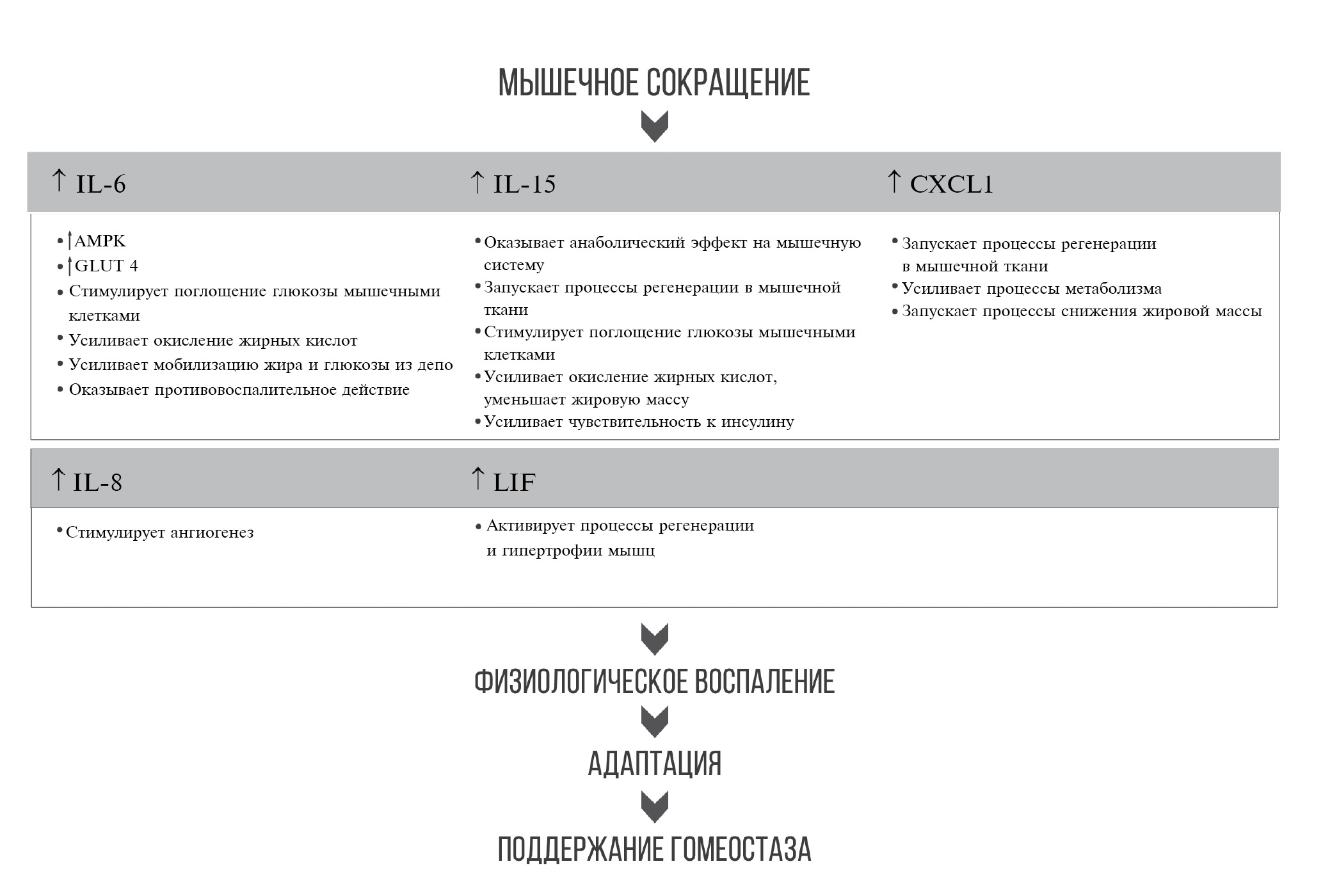 На фоне физической нагрузки в мышечных клетках происходит выделение такого же спектра цитокинов, характерных для воспалительных реакций, как при наличии патогенов. Однако эффекты этих цитокинов обеспечивают адаптационные изменения в организме и поддержание гомеостаза. В связи с этим актуальным является вопрос рассмотрения миоикинового профиля на фоне физической нагрузки как фактора физиологического воспаления. В настоящее время идентифицировано более 3000 миокинов [5], и продолжают открываться новые, но функции многих из них остаются недостаточно изученными. В высоких концентрациях мышцами секретируются IL-6, IL-8, IL-15, CXCL1, LIF, BDNF, иризин и др. Усиление продукции этих белков, которые могут действовать как мощные медиаторы передачи сигналов другим клеткам и тканям, подчеркивает важную роль скелетных мышц как секреторного органа.
