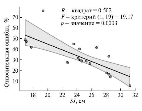 Поскольку показатель относительной ошибки рассчитывали с использованием максимальной высоты прыжка, были построены регрессионные модели взаимосвязи этих двух переменных для опровержения гипотезы о взаимной корреляции. По результатам регрессионного анализа не было выявлено взаимозависимости максимальной высоты прыжка и относительной ошибки в группе фоновых исследований СИ. Однако тестирование, выполненное на R + 2 сутки, указывает на наличие значимой заметной взаимосвязи этих параметров в прыжках типа SJ (p < 0.05) (рис. 4). Построенная нами модель объясняет 50% взаимной изменчивости максимальной высоты прыжка и относительной ошибки.
