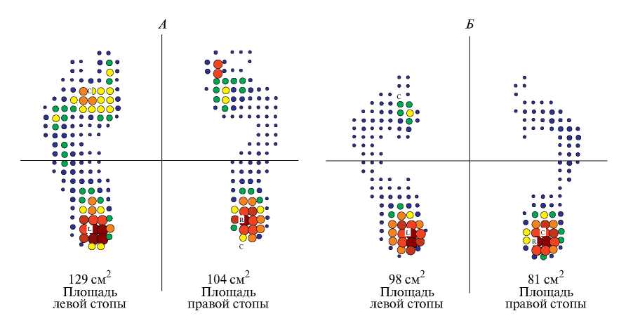 Рис. 1. Изменение площади плантарной поверхности правой и левой стоп у детей 7–10 лет до (А) и после (Б) стандартной физической нагрузки.