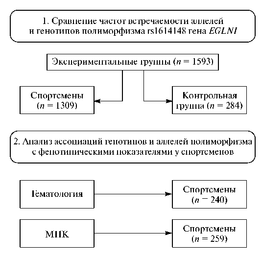 Для проведения исследования сравнения частот генотипов и аллелей полиморфизма rs1614148 гена EGLN1 было обследовано 1309 спортсменов, из них 538 женщин в возрасте 21.9 ± 4.1 лет и 771 мужчин 22.4 ± 4.8 лет, специализирующихся в различных видах спорта. Группу сравнения составили 284 чел. в возрасте 44.5 ± 4.1 лет, не занимающиеся спортом (рис. 1).