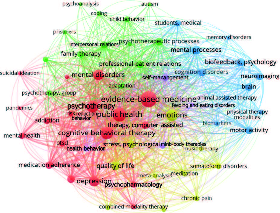 Цель – провести семантический анализ ключевых слов, полученных при помощи программы VOSviewer, в зарубежных статьях по психотерапии, проиндексированных в PubMed за 10 лет (2012–2021 гг.).
