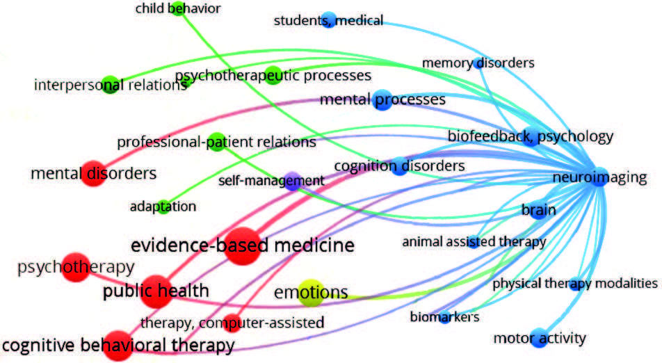 Статей, в которых изучались вопросы доказательной медицины и других обобщенных терминов 1-го кластера, например, организации здравоохранения, было 16,6 тыс., когнитивно-поведенческой терапии – 12,8 тыс., прочих методик психотерапии – 9,6 тыс., психических расстройств – 7,9 тыс., терминов, которые составили другие кластеры, например, нейровизуализации (2-й кластер) – 3,6 тыс., эмоций (3-й кластер) – 9,4 тыс., отношения врач–пациент – 3,6 тыс., самооценки (5-й кластер) – около 4 тыс. статей. Наглядно взаимоотношения обобщенных ключевых слов 1-го кластера изображены на рис. 2.
