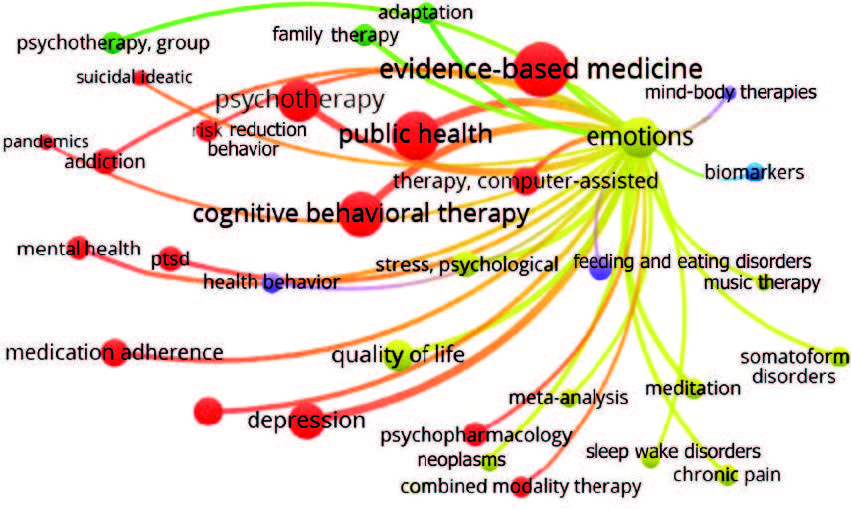При помощи семантического анализа 532 ключевых слов, найденных с помощью программы VOSviewer в массиве 79,6 тыс. иностранных статей по психотерапии, проиндексированных с 2012 по 2021 г. в PubMed, создали 56 терминов, статьи которых распределились в 5 кластеров: