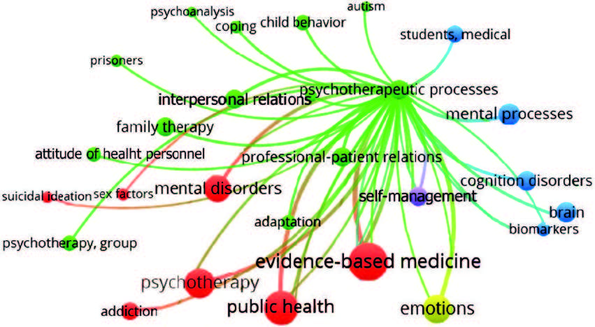 Methodology. Using the VOSviewer program, 79,6 thousand articles on psychotherapy indexed in the international database PubMed in 2012–2021 were analyzed. With 250 repetitions, 532 keywords were identified, which were routinely combined into 56 terms according to their semantic content.
