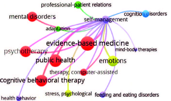 Results and their analysis. The combined terms allowed to distribute the array of articles into 5 clusters. In the 1st cluster the authors mainly presented the results of mental impact on patients from the standpoint of evidence-based medicine and the basic principles of health care and healthcare organization with a total link strength of 51.9 % of the total array of articles. In the 2nd cluster, mental processes were studied, including cognitive, movement disorders and memory disorders. A significant place in the study of these disorders was given to biological aspects and techniques with biofeedback, animal therapy and physiotherapy; the link strength was 15.4 %. In the 3rd cluster, emotions were analyzed that were interdependent with indicators of the quality of life of patients, stress levels, the formation of somatoform disorders, etc. As a rule, meditation and music therapy techniques were used to correct these disorders, the strength of the connection was 14.4 %. In the 4th cluster, the authors investigated social relationships, for example between professionals and patients, interpersonal relationships of patients, and mental adaptation. Optimization of these relationships was carried out using specific psychotherapeutic processes, group psychotherapy and psychoanalysis, the link strength was 13.8 %. In the 5th cluster, issues of self-control, self-esteem, self-efficacy of patients, and their attitude to a healthy lifestyle were studied. Possible behavioral disorders were corrected with the help of bodily therapy, the link strength was 4.5 %.