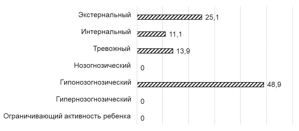 В результате клинико-психологического исследования определена структура родительского отношения к болезни ребенка с расстройством аутистического спектра. Преобладающим типом родительского отношения к болезни ребенка является гипонозогнозический (48,9 %): так, для родителей детей с РАС свойственно преуменьшение тяжести состояния ребенка, в отдельных случаях имеет место отрицание болезни. Также в числе ведущих типов отношения к болезни ребенка у родителей выявляются экстернальный (25,1 %) и интернальный (11,1 %) типы. Стоит отметить, что в настоящем исследовании не выявлено родителей с ведущими нозогнозическим, гипернозогнозическим и ограничивающим активность ребенка типами отношения к болезни.
