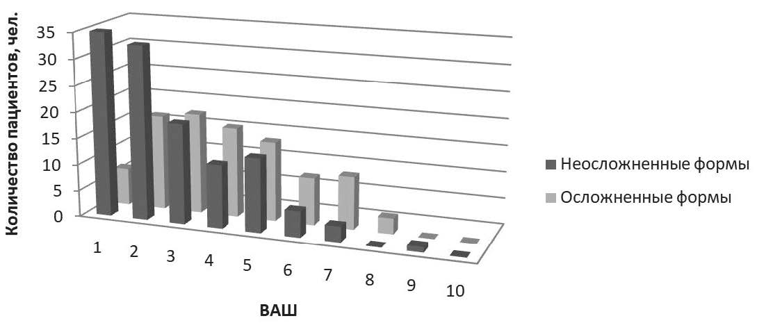 Как показано в табл. 2, уровень боли по ВАШ до лечения у пациентов в группе с осложненными формами ШГД достоверно выше (8,35 ± 1,7), чем в группе с неосложненными вариантами ШГД (5,93 ± 2,2) (p_value = 4,22e-14 < 0,05).