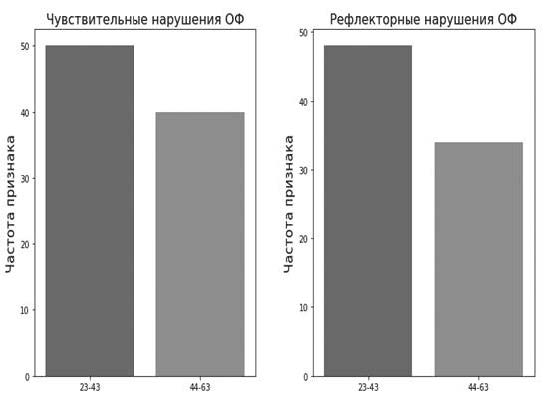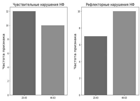 Рис. 7. Зависимость возникновения чувствительных и рефлекторных нарушений от возраста в группе
