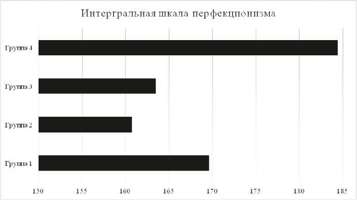 Был проведен анализ интегрального уровня перфекционизма у пациенток из всех групп. Средние значения находятся в интервале от 160 до 204 баллов, что соответствует среднему уровню выраженности перфекционизма (рис. 1).