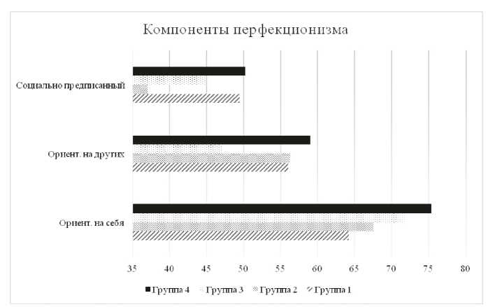 Также в каждой группе были проанализированы компоненты перфекционизма (рис. 2). Во всех группах пациенток наименьшие значения получены по шкале «Социально предписанный перфекционизм», средние – по шкале «Перфекционизм, ориентированный на других» и наивысшие – по шкале «Перфекционизм, ориентированный на себя».