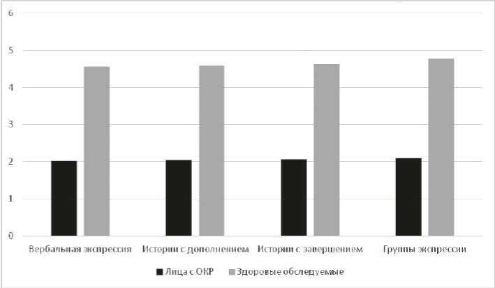 Прицельный анализ социального восприятия лиц с ОКР, показал существенное снижение социальной перцепции – первого этапа социального восприятия. Отмечаются выраженные трудности прочтения состояний по мимике (7,79 ± 0,28). Показатель здоровых обследуемых соответствует норме (17,06 ± 0,33). Различия статистически значимы (р = 0,04).