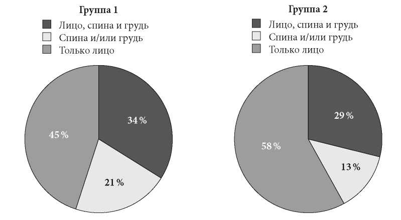 Таким образом, тотальное поражение чаще встречается у пациентов группы 1, чем в группе 2, а изолированное – при акне взрослых пациентов.