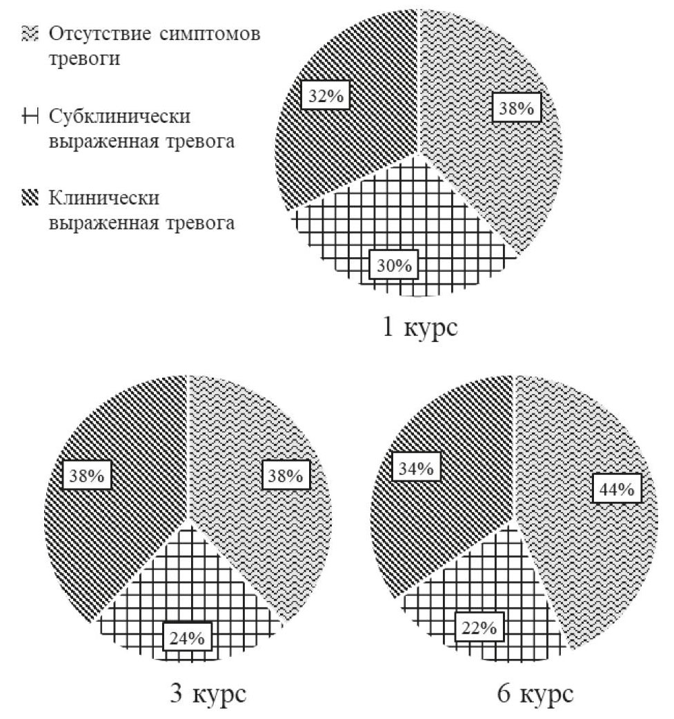 На протяжении всего процесса обучения наиболее актуальным стрессом студентовмедиков является учебная нагрузка. Наличие вредных привычек не зависит от курса (p > 0,05). Исходя из данных стресс-теста В.Ю. Щербатых у студентов 1-го, 3-го и 6-го курса наиболее выраженными стали 3-я и 4-я стадии стресса. В основном у всех студентов отмечалась поведенческая стратегия «оптимизм во всех ситуациях, включая неопределенные». Второй по встречаемости стратегией стала целеустремленность в разрешении возникших проблем. У 37,83 % студентов на 1-м курсе, 38,16 % на 3-м курсе и 43,66 % на 6-м курсе не отмечалась выраженная тревога. При статистическом анализе частоты встречаемости клинически и субклинически выраженной тревоги статистически значимых различий между курсами не обнаружено (p > 0,05).