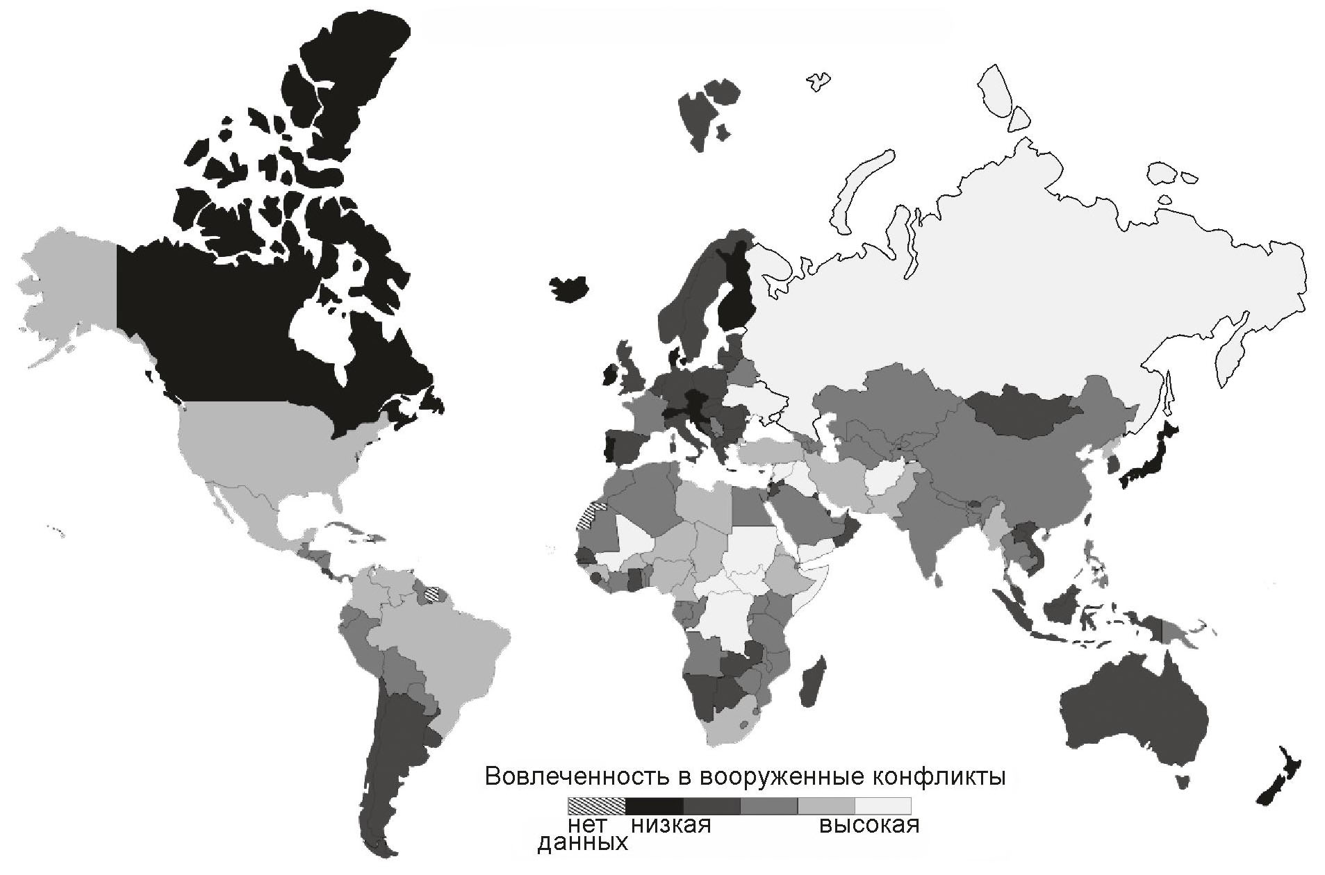В 2023 г. в мире произошли 56 вооруженных конфликтов и войн, и их количество не уменьшается. Вооруженные конфликты стали более международными – за пределами своих границ в них участвовали 92 страны (рис. 1). Экономические траты на вооруженное насилие достигли 19,1 трлн долларов США (в 2022 г. – 17,5 трлн долларов), что составило 13,5 % от мирового валового внутреннего продукта или 2380 долларов на каждого человека. В 2023 г. число погибших в мире в результате вооруженных конфликтов оказалось более 162 тыс. человек, а за первые 4 мес 2024 г. – 47 тыс. человек. Из-за вооружённых конфликтов 110 млн человек являются или беженцами, или внутренне перемещёнными лицами. В настоящее время в 16 странах проживают более 500 тыс. беженцев [9].