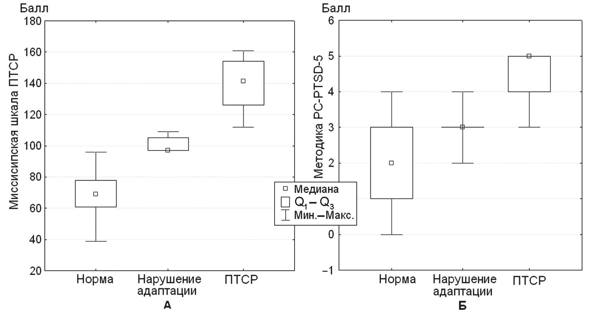 Рис. 2. Качественный общий показатель в группах комбатантов по военному варианту миссисипской шкалы ПТСР (А) и методике PC-PTSD-5 (Б)