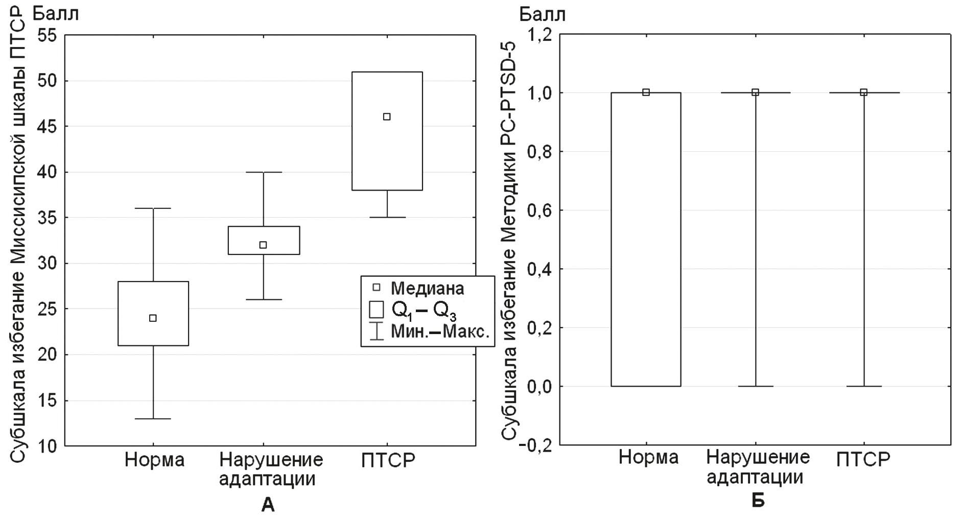 Рис. 3. Качественный показатель субшкалы избегание в группах комбатантов по военному варианту миссисипской шкалы ПТСР (А) и методике PC-PTSD-5 (Б)