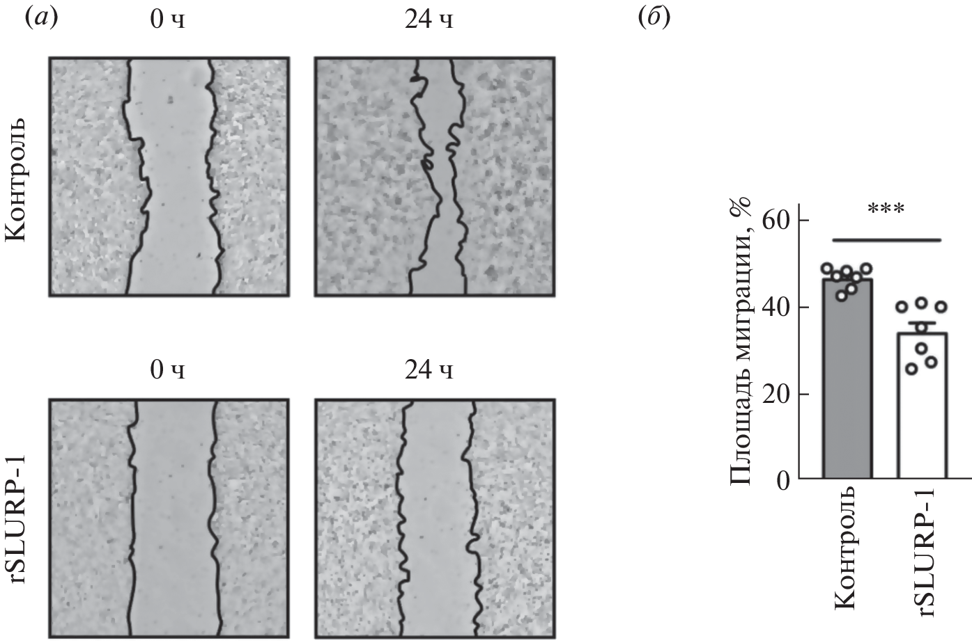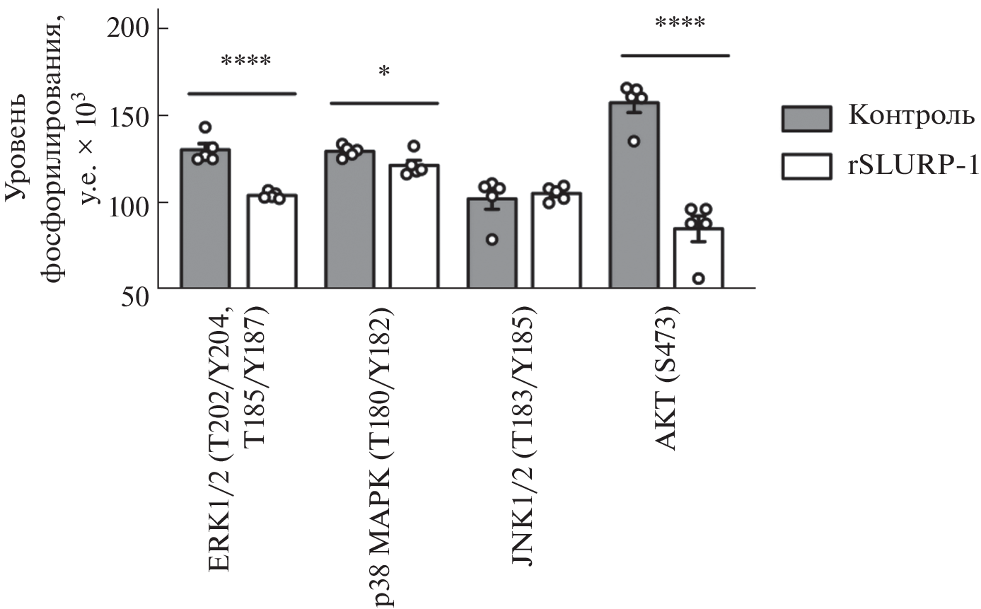 A recombinant analog of the human SLURP-1 protein (rSLURP-1) effectively inhibits the growth of carcinomas by interaction with the α7-type nicotinic acetylcholine receptor. Recently, rSLURP-1 inhibition of gliomas growth in vitro was shown by the authors, although, the mechanism of rSLURP-1 action was not studied. Here, we showed that rSLURP-1 selectively inhibits the growth of U251 MG glioma cells but not of normal astrocytes, and controls glioma cell migration. In addition, rSLURP-1 induces cell cycle arrest in the G2/M phase in U251 MG glioma cells, but does not result in apoptosis. Incubation of U251 MG cells with rSLURP-1 causes inhibition of phosphorylation of ERK, p38 MAPK, and AKT kinases, the activation of which contributes to the progression of gliomas. At the same time, rSLURP-1 does not affect the activity of JNK kinase. Thus, rSLURP-1 is an endogenous protein promising for the development of drugs based on it for the treatment of not only carcinomas, but also gliomas.