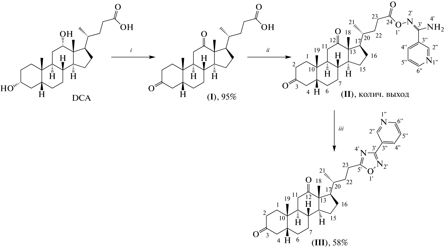 5-α-Reductase (5-AR) inhibitors are considered the most effective drugs in the treatment of proliferative processes in prostate adenoma. These include two synthetic azasteroids – finasteride and dutasteride, which cause side effects in conditions of long-term course therapy which form the disorders of sexual function in men. We propose 3-meta-pyridine-1,2,4-oxadiazole derivative of deoxycholic acid as prototype of low-toxic 5-AR inhibitors. It has been shown that the new agent is able to penetrate the 5-AR binding site through the formation of covalent adducts with NADP-H, like finasteride. At the same time, both ligands have comparable with the target binding energy values (–20 and –15 kcal/mol, respectively, for finasteride and target compound). In experiments on testosterone and sulpiride models of BPH, we have found that intragastric administration of DCA derivative at a dose of 20 mg/kg and finasteride at a dose of 10 mg/kg has a similar prostatoprotective effect by reducing proliferative processes in the glandular epithelium and prostate stroma of rats. The new agent is less toxic than finasteride: the LD50 value in mice is >1500 mg/kg versus 1060 mg/kg in finasteride. Based on the results obtained, the 3-meta-pyridine-1,2,4-oxadiazole derivative of deoxycholic acid can be considered as a promising candidate for preclinical testing.