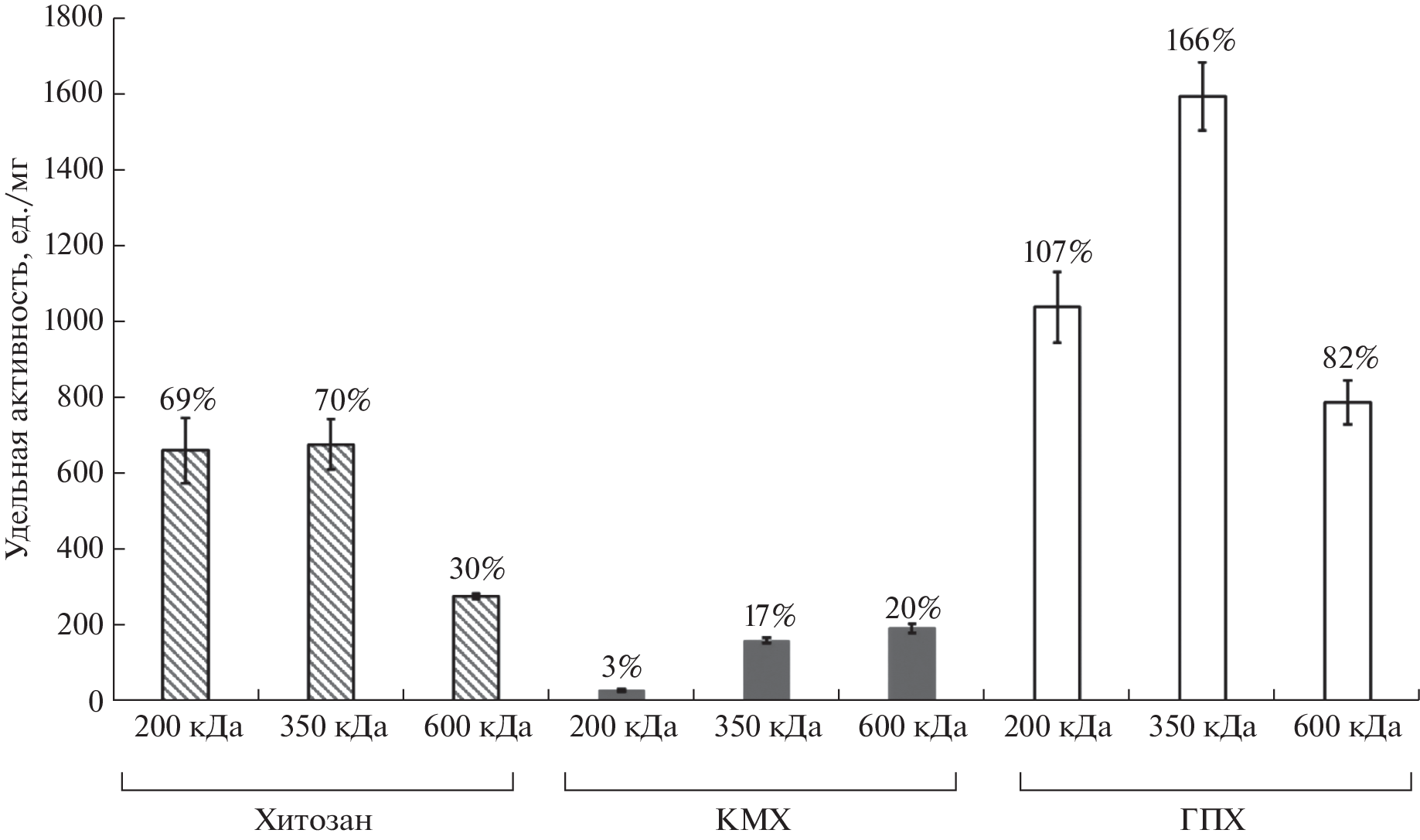 Chitosan derivatives – сarboxymethyl chitosan and N-(2-hydroxy)propyl-3-trimethyl ammonium chitosan with molecular weights of 200, 350, and 600 kDa have been synthesized. Complexes of ficin with chitosan and its named derivatives have been obtained. IR spectra of chitosan, carboxymethylchitosan, and N-(2-hydroxy)propyl-3-trimethyl ammonium chitosan and their complexes with ficin were recorded. The analysis of the spectra confirmed the formation of conjugates between the macromolecules of polysaccharides and ficin. The optimal ratio of protein content (0.7 mg/g of carrier) and specific activity (1590 units/mg of protein) was found during the complexation of ficin with the N-(2-hydroxy)propyl-3-trimethylammonium chitosan matrix with the molecular weight 350 kDa. The efficiency of ficin complexation (in terms of specific catalytic activity) with N-(2-hydroxy)propyl-3-trimethyl ammonium chitosan (350 kDa) exceeds that of chitosan (350 kDa) and carboxymethylchitosan (350 kDa) 2.4 and 9.8 times respectively. The types of interactions, first binding energies, amino acid composition of ficin surfaces, which interact with the carrier in the process of complexation, were studied by molecular docking. It has been established that bonds and interactions with chitosan and its derivatives are formed, among other things, with the participation of amino acid residues located near the ficin active site (Cys25 and His162), which explains the change in the proteolytic activity of the obtained complexes. Ficin complexes with N-(2-hydroxy)propyl-3-trimethyl ammonium chitosan are soluble in a wide pH range and, therefore, may be more promising than protease-chitosan complexes in the development of medical preparations and biocatalysts for the food, brewing, and leather industries.