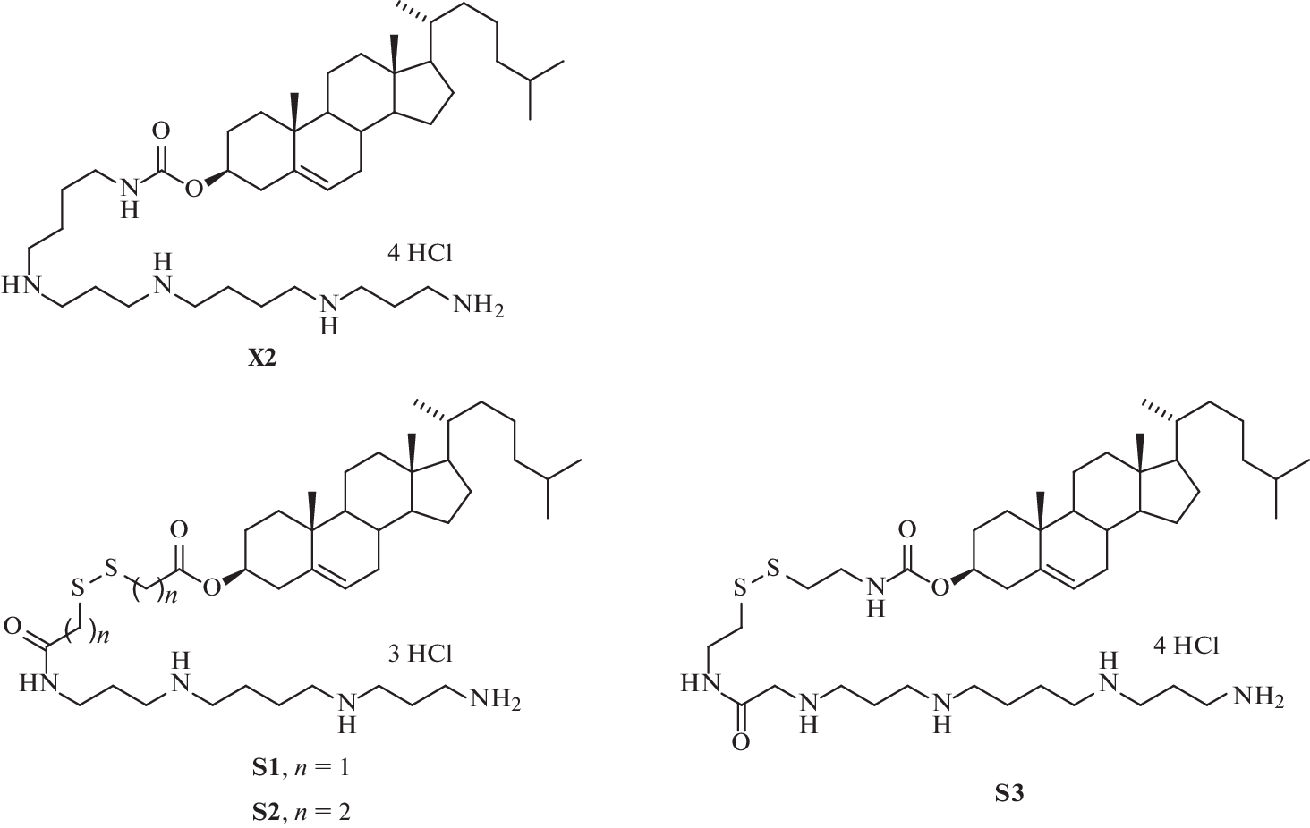 The synthesis of new polycationic amphiphiles containing a disulfide group in their structure has been carried out. Cationic liposomes were formed on the basis of the obtained compounds and helper lipid 1,2-dioleoyl-sn-glycero-3-phosphatidylethanolamine, which demonstrated the absence of toxicity to HEK293 and HeLa cells and high delivery efficiency of fluorescently labeled oligodeoxyribonucleotide. The efficiency of plasmid DNA delivery depended on the cell line and structure of the amphiphile, with liposomes based on tetracationic amphiphiles being the most effective transfectants. These liposomes may be used for in vitro transfection of eukaryotic cells as well as for further in vivo biological tests.