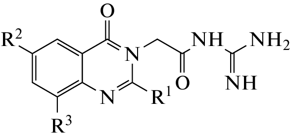 Based on the data of the role of Na+/H+-exchanger (NHE) in the modulation of intraocular pressure, which is the main factor in the development of glaucoma, and previously conducted studies by various authors proving the presence of inhibitory NHE-1 activity in quinazoline derivatives, nine new compounds belonging to this class were synthesized. The effect of the obtained quinazoline derivatives on the inhibition of Na+/H+-exchanger and their on intraocular pressure (IOP) in comparison with zoniporide (NHE inhibitor) and timolol (a drug for lowering IOP used in clinical practice) was studied. Among the compounds studied in vitro, all quinazoline derivatives at a concentration of 1 nM inhibited the activity of NHE-1, the most active compound was a derivative of quinazoline acetylguanidine. However, not all compounds showed IOP-reducing activity in vivo in rats. So the most active of the quinazoline derivatives are 4-oxoquinazoline acetylguanidine, its brominated derivative at position C6 and quinazoline propionylguanidine. The structure–activity analysis showed that the presence of the Br atom at the C6 position of the 4-oxoquinazoline acetylguanidine derivative leads to a maximum decrease in IOP during instillation of the solution of the compound.
