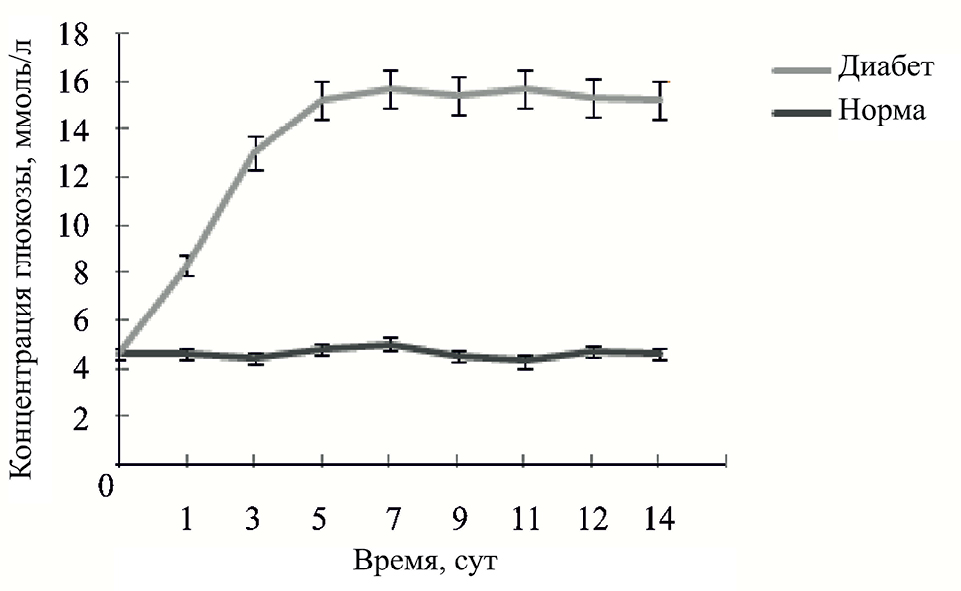 Эксперимент проводили на самцах крыс линии Wistar, которых перед началом эксперимента произвольным образом разделили на две группы (n = 8). В группе “Диабет” для индукции патологии животным однократно внутрибрюшинно вводили 5%-ный раствор аллоксана (доза 150 мг/кг массы тела), предварительно растворенный в 0.9%-ном цитрате натрия. Крысам контрольной группы (Норма) вместо аллоксана осуществляли инъекцию 0.9%-ного цитрата натрия.