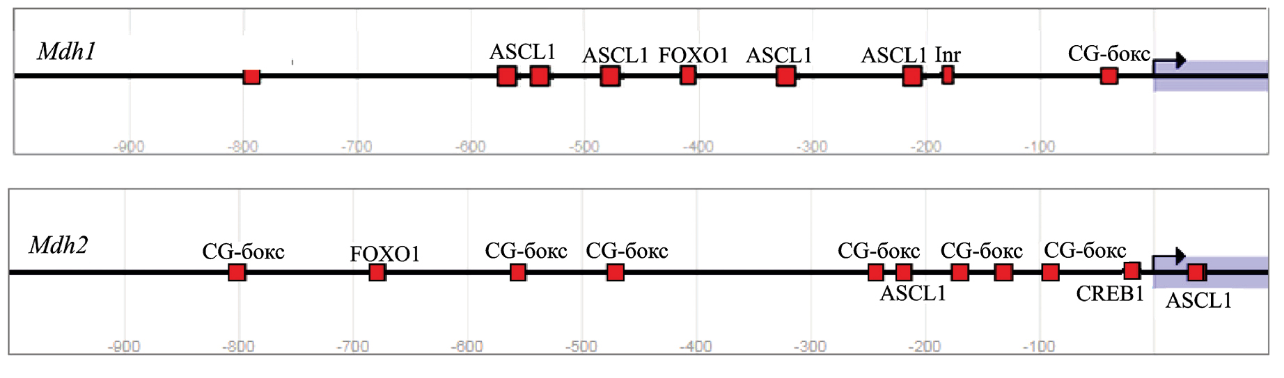 Рис. 5. Структура промоторов генов Mdh1 (Gene ID: 24551) и Mdh2 (Gene ID: 81829) в геноме крысы. Inr – инициатор и CG-бокс (регуляторные элементы); показаны сайты посадки для транскрипционных факторов: ASCL1 (achaete-scute complex-like), FOXO1 и CREB1.