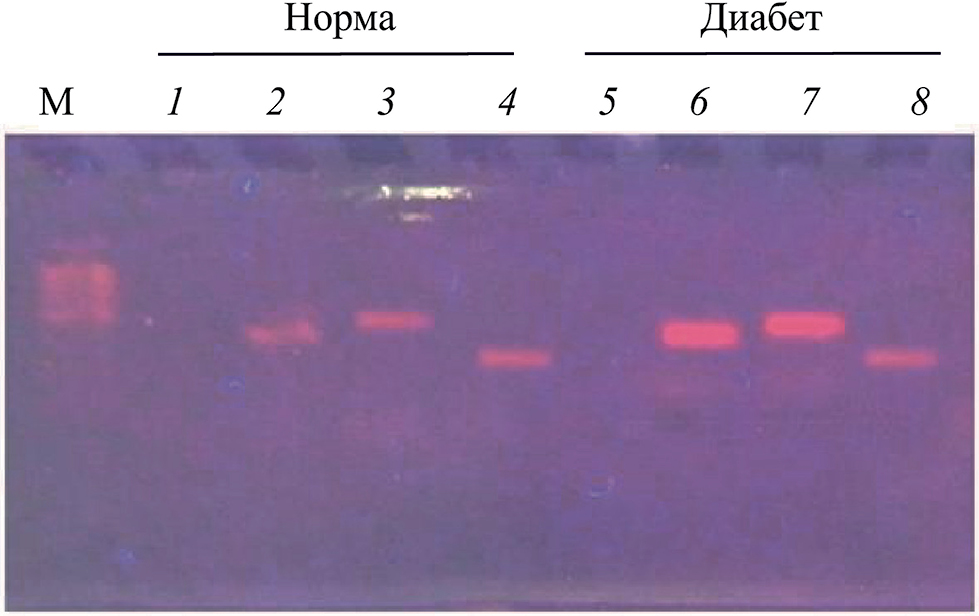 Рис. 6. Электрофореграмма ПЦР-продуктов после ПЦР в реальном времени. М – маркеры длин ДНК 250–1000 п.н. (Диаэм, Россия), 1 и 5 – отрицательный контроль, 2 и 6 – продукты гена Mdh1, 3 и 7 – продукты гена Mdh2, 4 и 8 – продукты гена Eef1a1. Норма – группа контрольных крыс, Диабет – животные с аллоксановым диабетом.