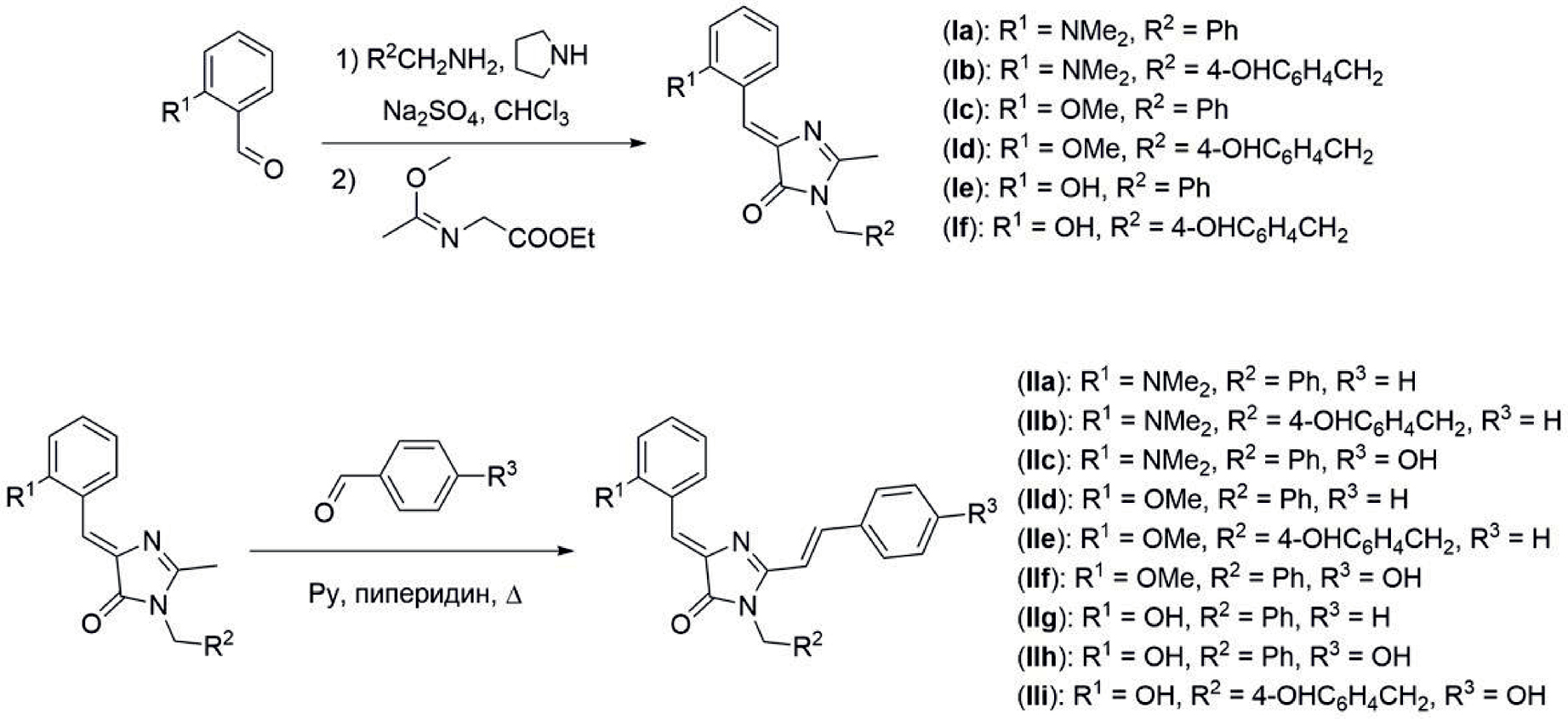 На первом этапе работы мы синтезировали ряд арилиден-имидазолонов, содержащих разные заместители в орто-положении бензилиденового фрагмента (схема 2, соединения (I)). Производные (I) были получены при взаимодействии исходных ароматических альдегидов с иминоэфиром и бензиламином или тирамином. Затем из полученных арилиден- имидазолонов были синтезированы производные хромофора белка Kaede (схема 2, соединения (II)). Имидазолоны конденсировали с бензальдегидом или 4-гидроксибензальдегидом в пиридине в присутствии пиперидина.