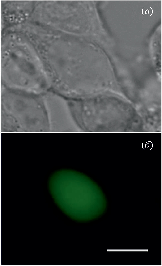 Получение ДНК-конструкций. Кодирующая последовательность NanoLuc была синтезирована фирмой Клонинг Фасилити (Россия) и получена в плазмиде Level 0, созданной для клонирования MoClo. Для локализации в клеточном ядре последовательность, кодирующую NanoLuc [13], сливали с последовательностью белка-гистона H2B (UniProt ID: P06899), используя технологию Golden Gate согласно синтаксису MoClo. Конструкт был помещен между CMV-промотором и последовательностью SV40 poly(A). Для клонирования использовали эндонуклеазу рестрикции Eco31I (BsaI) (Thermo Scientific, США) и T4 ДНК-лигазу (Евроген, Россия). Правильность полученных конструкций была подтверждена секвенированием по Сэнгеру (Евроген, Россия).