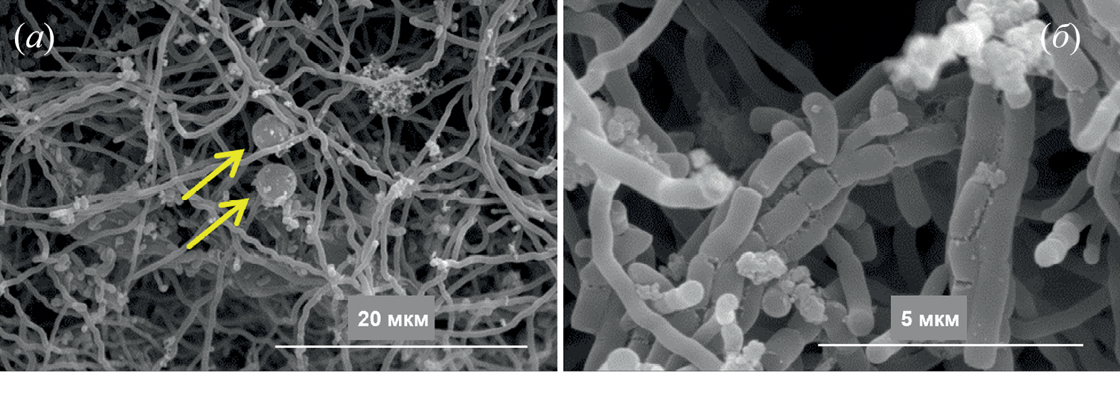 Рис. 2. Сканирующая электронная микроскопия штамма Nocardiopsis alba SM-1, выращенного на среде Мюллера–Хинтона в течение 5 сут при 28°C. Стрелками показаны округлые спорангиеподобные структуры.