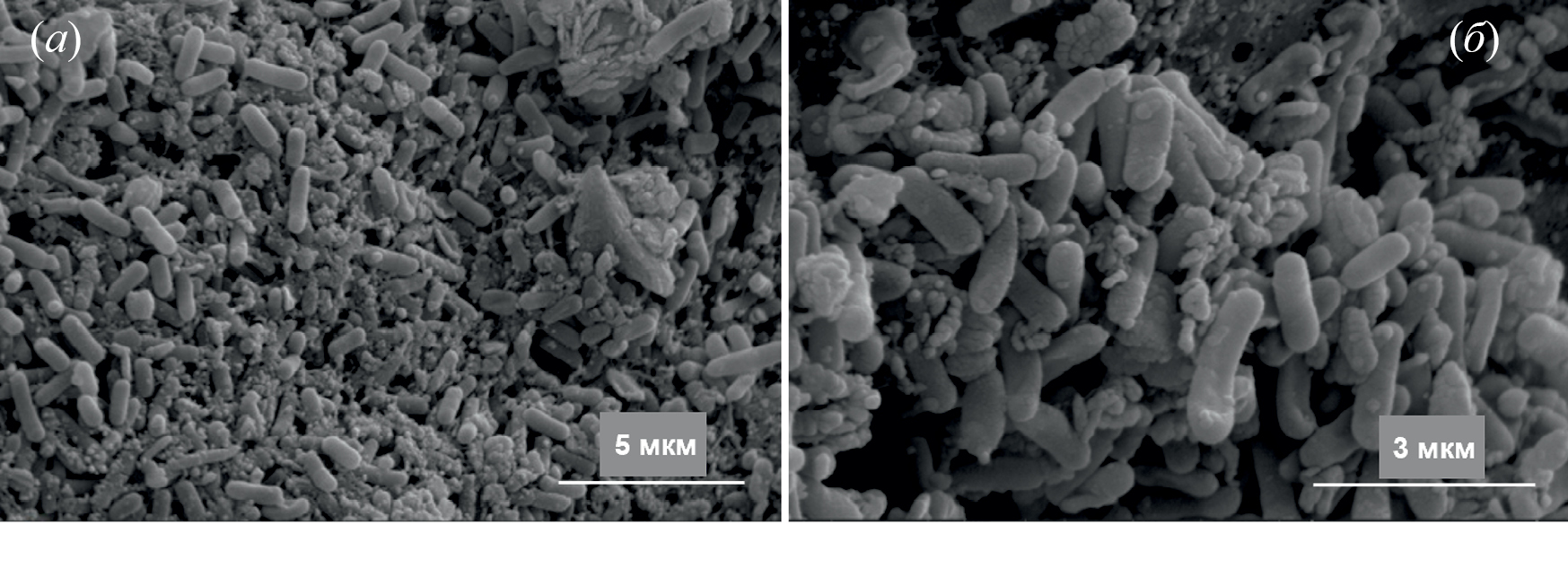 Мы использовали два метода сканирующего анализа: сканирующую электронную микроскопию (SEM) и сканирующую электронную микроскопию с режимом естественной среды (ESEM), основываясь на имеющихся на данный момент опубликованных данных о том, что ESEM и SEM могут дополнять друг друга [34]. Используя SEM, можно получать изображения поверхности биологических образцов с высоким разрешением, однако этот метод требует дополнительной пробоподготовки. В свою очередь, ESEM позволяет исследовать препараты в их естественном состоянии, но получаемые изображения будут иметь меньшее разрешение и соотношение сигнал/шум. Результаты, полученные этими методами, могут немного отличаться из-за разницы в процессе подготовки образцов [35, 36]. SEM обладает уникальными преимуществами, такими как высокое разрешение и большая глубина резкости [37]. Основное преимущество ESEM – возможность визуализации гидратированных и непроводящих образцов, таких как биологические ткани и (бактериальные) клетки, без предварительного обезвоживания или нанесения проводящего покрытия [36, 37].