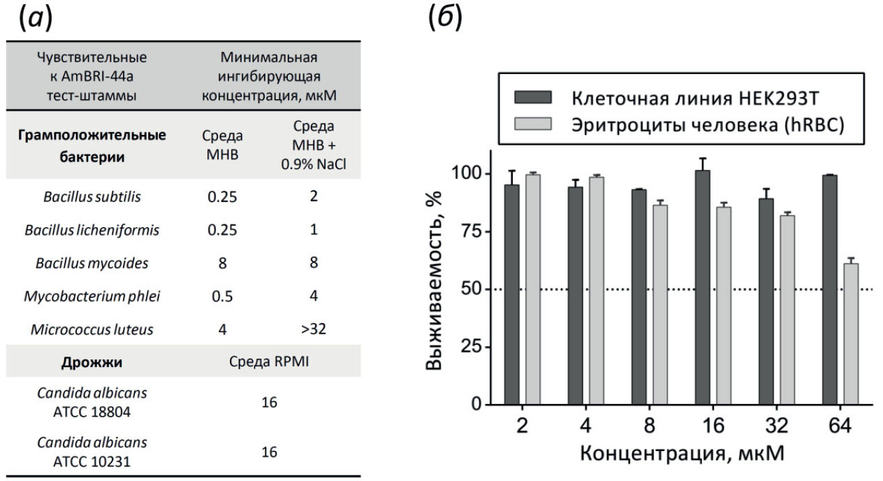 Антимикробная активность, селективность действия и цитотоксичность пептида AmBRI44a. На следующем этапе исследовали антимикробную активность пептида AmBRI-44a в отношении широкого спектра грамположительных и грамотрицательных штаммов бактерий и дрожжеподобных грибов (рис. 3а), а также его потенциальное токсическое воздействие на клетки млекопитающих (рис. 3б).