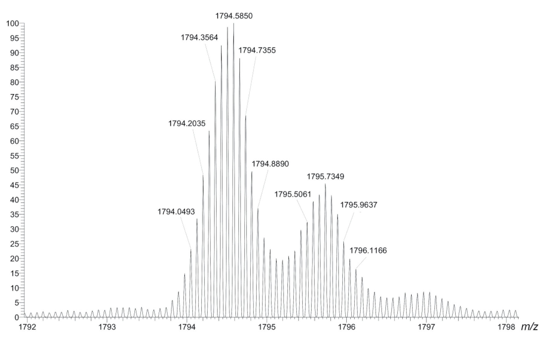 Рис. 3. Фрагмент масс-спектра высокого разрешения белка из фракции 5 (рис. 2). Показаны сигналы, соответствующие ионам [M + 13H]+13, z = 13.