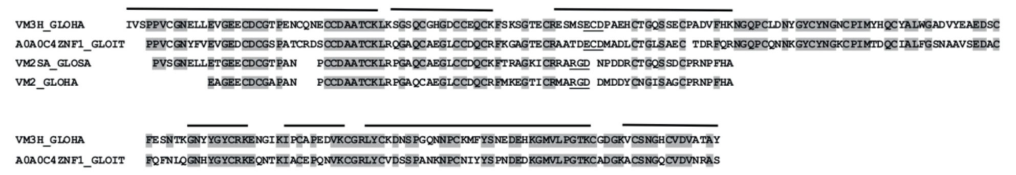 Рис. 5. Сравнение аминокислотных последовательностей некаталитических доменов металлопротеиназ некоторых видов щитомордников (род Gloydius). VM3H_GLOHA –халисетин (halysetin) из яда Agkistrodon (Gloydius) halys, A0A0C4ZNF1_GLOIT – фрагмент металлопротеиназы PIII Gloydius intermedius, VM2SA_GLOSA – фрагмент металлопротеиназы РII Gloydius saxatilis, VM2_GLOHA – дизинтегрин саксатилин (saxatilin) Gloydius saxatilis. Линии над последовательностями указывают пептиды халисетина, обнаруженные методом масс-спектрометрии в гидролизате нашего белка. Подчеркнуты остатки активных центров, идентичные остатки выделены серым цветом.