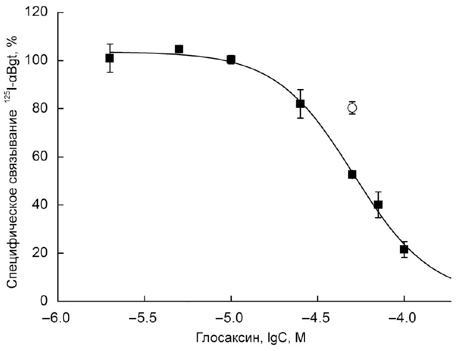 Взаимодействие выделенного белка с нХР. Эффективность взаимодействия глосаксина с нХР оценивали по его конкуренции с радиоактивным α-Bgt (125I-αBgt) за связывание с мембранами электрического органа ската T. californica, содержащими рецепторы мышечного типа (α12β1γδ), и с клетками линии GH4C1, экспрессирующими нейронные нХР подтипа α7 человека. При этом установлено, что глосаксин ингибирует связывание 125I-αBgt с мембранами T. californica с величиной IC50 = 50.9 ± 1.83 мкМ (рис. 6). В концентрации 50 мкМ он ингибировал связывание 125I-αBgt с α7 нХР лишь на 20%.