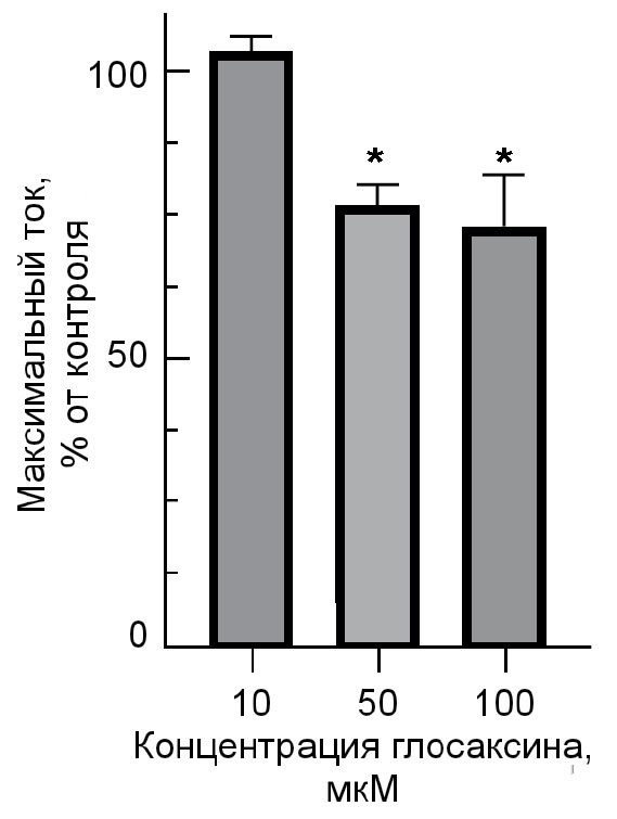 Рис. 7. Ингибирование глосаксином токов, индуцируемых ацетилхолином в нХР α3β2-типа. Регистрировали ответ ооцита шпорцевой лягушки X. laevis на внесение 50 мкМ ацетилхолина без добавления белка (100%) и после 1 мин инкубации с различными концентрациями белка (n = 3). * p < 0.05 (t-критерий Стьюдента).