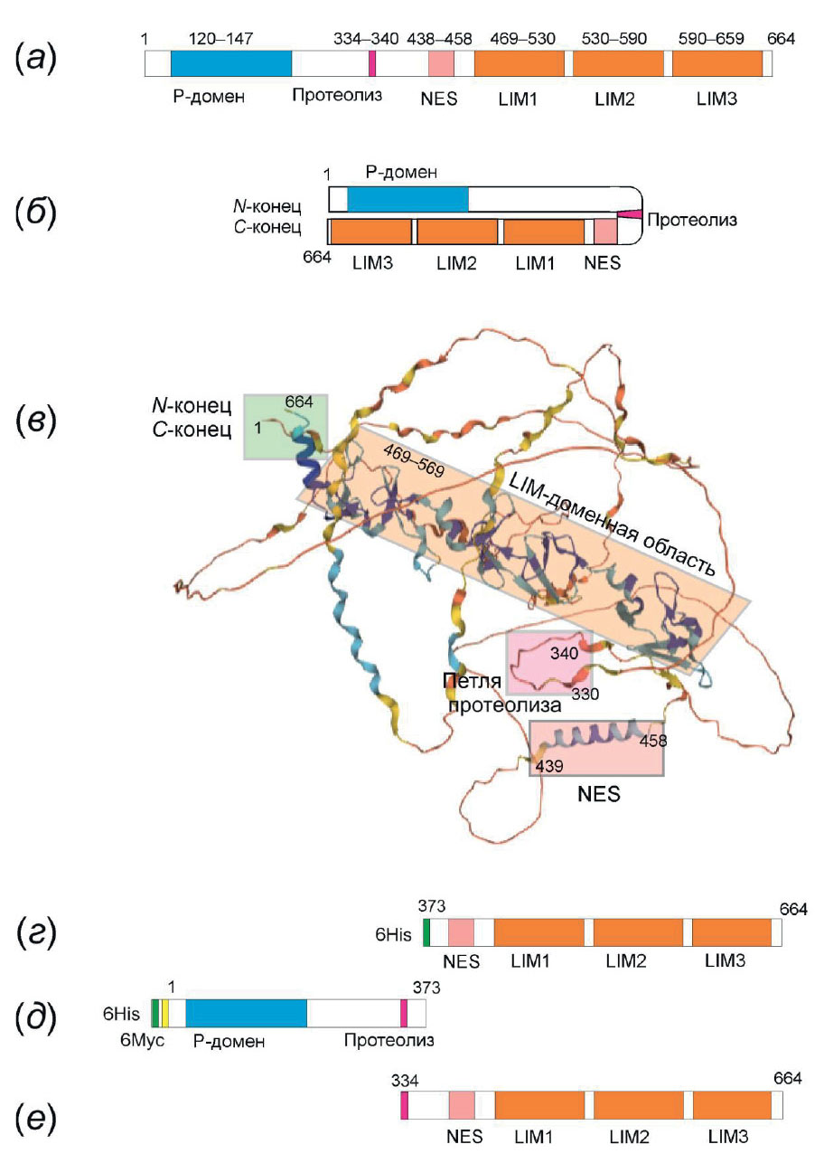Рис. 1. Схемы доменной и пространственной организации молекулы зиксина и делеционных конструкций, использованных в работе: (а) – схема доменной структуры полноразмерной молекулы зиксина, сверху обозначены номера аминокислотных остатков для всех представленных на рисунке доменов зиксина: P-домен 120–147 а.о. (пролин-богатый домен), протеолиз 334–340 а.о. (сайт возможного протеолитического расщепления), NES 438–458 а.о. (сигнал экспорта из ядра) и LIM-доменная область 469–659 а.о.; (б) – схема “закрытой” конформации молекулы зиксина; (в) – пространственная трехмерная структура зиксина, полученная по данным базы PhosphoSitePlus® (https://www.phosphosite.org); (г) – схема С-концевого делеционного мутанта, использованного для получения антител к С-зиксину; (д) – схема N-концевого делеционного мутанта, использованного для получения антител к N-зиксину; (е) – схема укороченного по сайту протеолиза делеционного мутанта зиксина (∆зиксина).