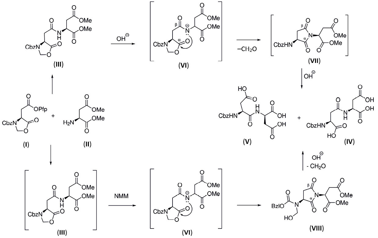 Ранее мы описали, что при взаимодействии пентафторфенилового эфира (S)-2-(3-((бензилокси)карбонил)-5-оксооксазолидин-4-ил)уксусной кислоты (I) с диметиласпартатом (II) образуется соединение, которому на основании анализа спектральных данных было приписано строение в виде дипептида (III), представляющего собой смесь E- и Z-ротамеров (см. далее), что осложняло интерпретацию спектров. В условиях реакции щелочного гидролиза этот полупродукт был превращен в целевую трикислоту (IV) и, вероятно, ее изомер (V) (схема 1) [5]. Мы предположили, что изомеризация протекает в условиях щелочного гидролиза через промежуточное образование продукта внутримолекулярной циклизации – аминосукцинимида (VII), который в условиях реакции гидролиза подвержен раскрытию гидроксид-анионом по любой из двух карбонильных групп. Такая циклизация с последующим раскрытием – фундаментальное химическое свойство производных аспарагина [6]. Эта побочная реакция описана на многих примерах, и степень ее протекания зависит от конкретной пептидной последовательности.