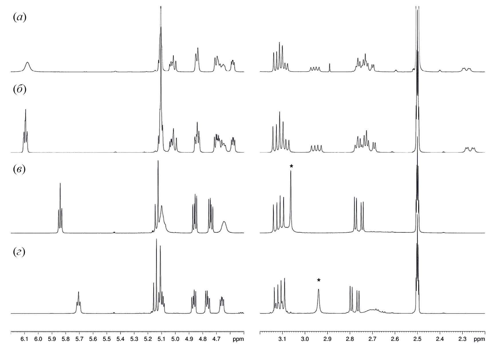 Рис. 1. Сравнение двух областей спектров продукта реакции соединений (I) и (II): (a) – при 298 К в обычном DMSO-d6; (б) – при 298 К в осушенном DMSO-d6; (в) – при 353 К; (г) – при 383 К. Звездочкой отмечен сигнал остаточной воды.