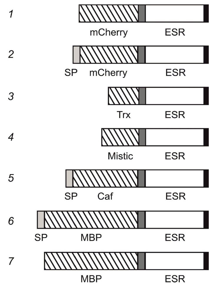Локализация в мембране, а также обнаружение единственной формы белков с помощью электрофореза и вестерн-блоттинга позволяют предположить, что в процессе секреции происходит отщепление сигнальных последовательностей у предшественников Caf-ESR и MBP-ESR, в результате чего их N-концевые растворимые домены располагаются в периплазматическом пространстве. Следует отметить, что экспрессия гибридного белка MBP-ESR, лишенного сигнальной последовательности, в данных условиях не была обнаружена. Также не удалось детектировать экспрессию N-концевых гибридов с mCherry (включая вариант с сигнальной последовательностью PelB), тиоредоксином и белком Mistic.