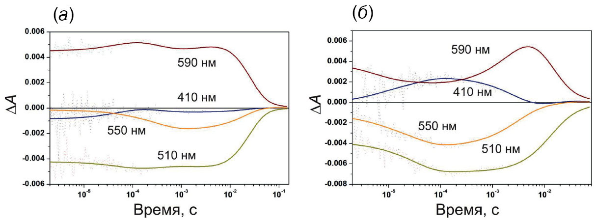Кинетику светоиндуцированных изменений поглощения MBP-ESR при четырех длинах волн измеряли при двух значениях рН, при этом, как и в случае дикого типа ESR [50], было обнаружено отсутствие интермедиата М (депротонированного основания Шиффа) при рН 7 (рис. 3а). Интермедиаты с максимумом поглощения 590 нм доминируют на протяжении всего фотоцикла. В течение первых 10 мкс после вспышки первый из них частично распадается с появлением других длинноволновых интермедиатов, распад которых с τ ~ 84 мс завершает фотоцикл (рис. 3а).