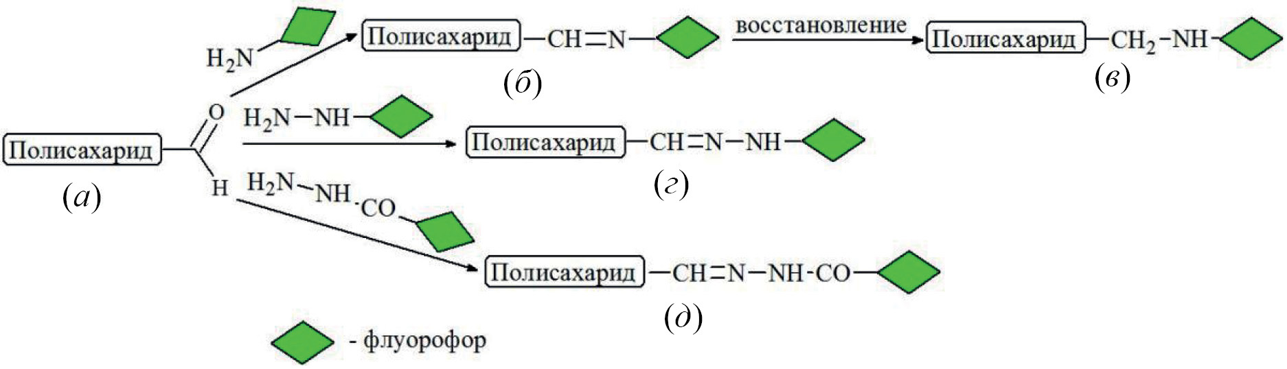 Рис. 1. Введение флуоресцентной метки по альдегидной группе (здесь и далее зеленый ромб – это флуоресцентная метка): восстанавливающий полисахарид (а), основание Шиффа (б), восстановленное основание Шиффа (в), гидразон – продукт реакции с гидразином (г), гидразон – продукт реакции с гидразидом (д).